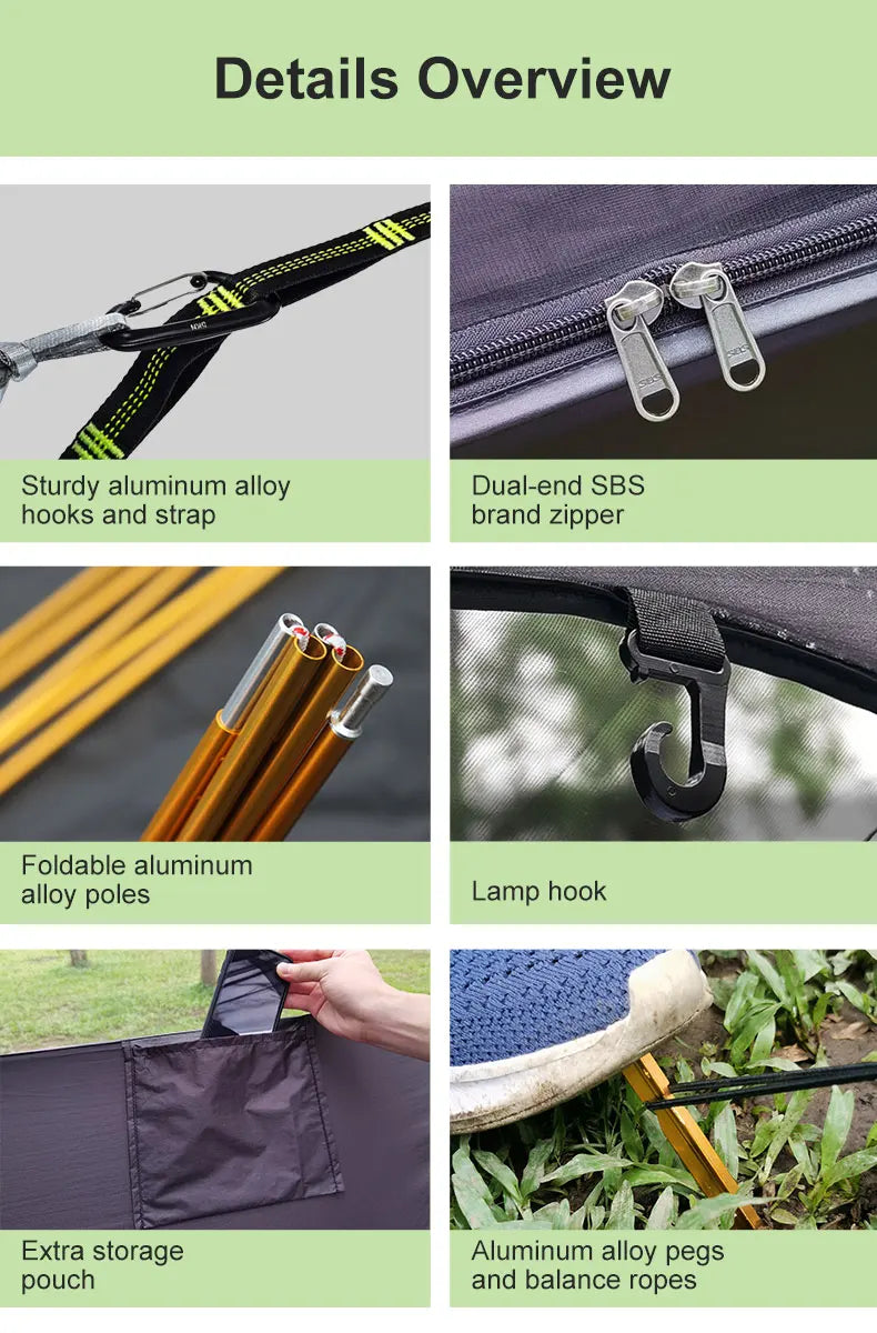 *3 in 1 Function Hammock - The Camping Hammock tent is multi-functional to be used as a hammock; Rotate the hammock, It can be used as an ordinary tree hammock; When using with the rain fly, the hammock becomes a heavy rain waterproof tent with nice air flow.