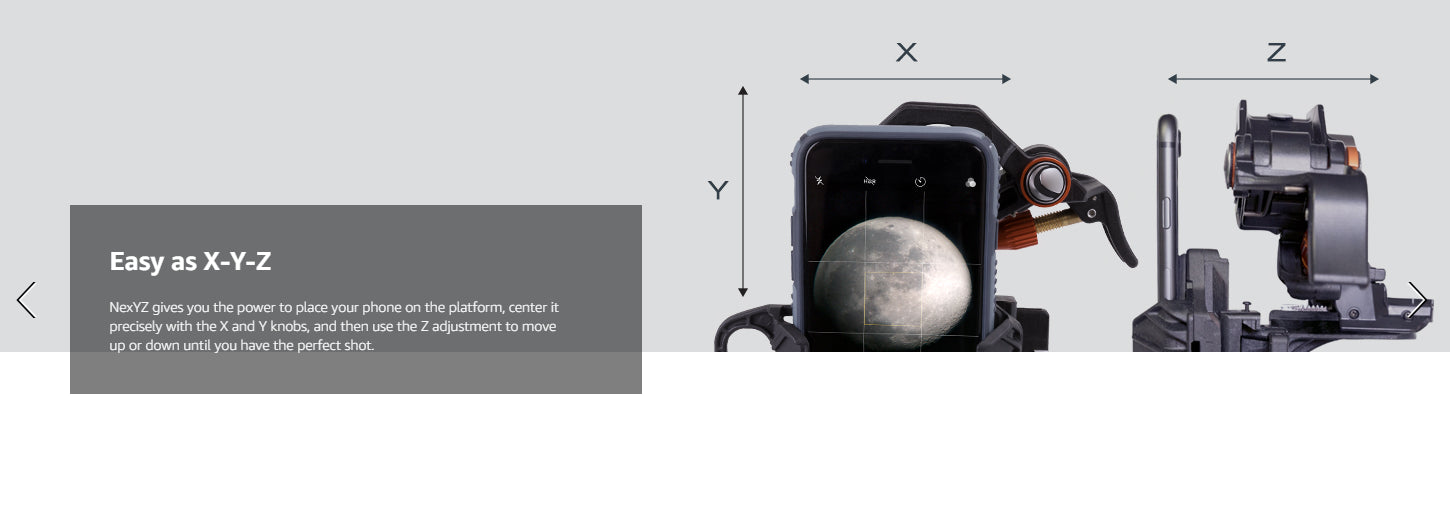 Features three directional knobs (X, Y, and Z axis) for quick and precise alignment of the phone's camera with the eyepiece