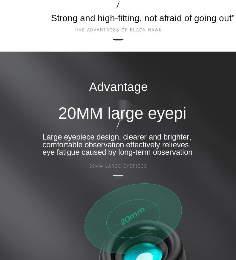 Twist-up eyecups with multiple positions correctly position the eyes for comfortable viewing with orwithout glasses.
