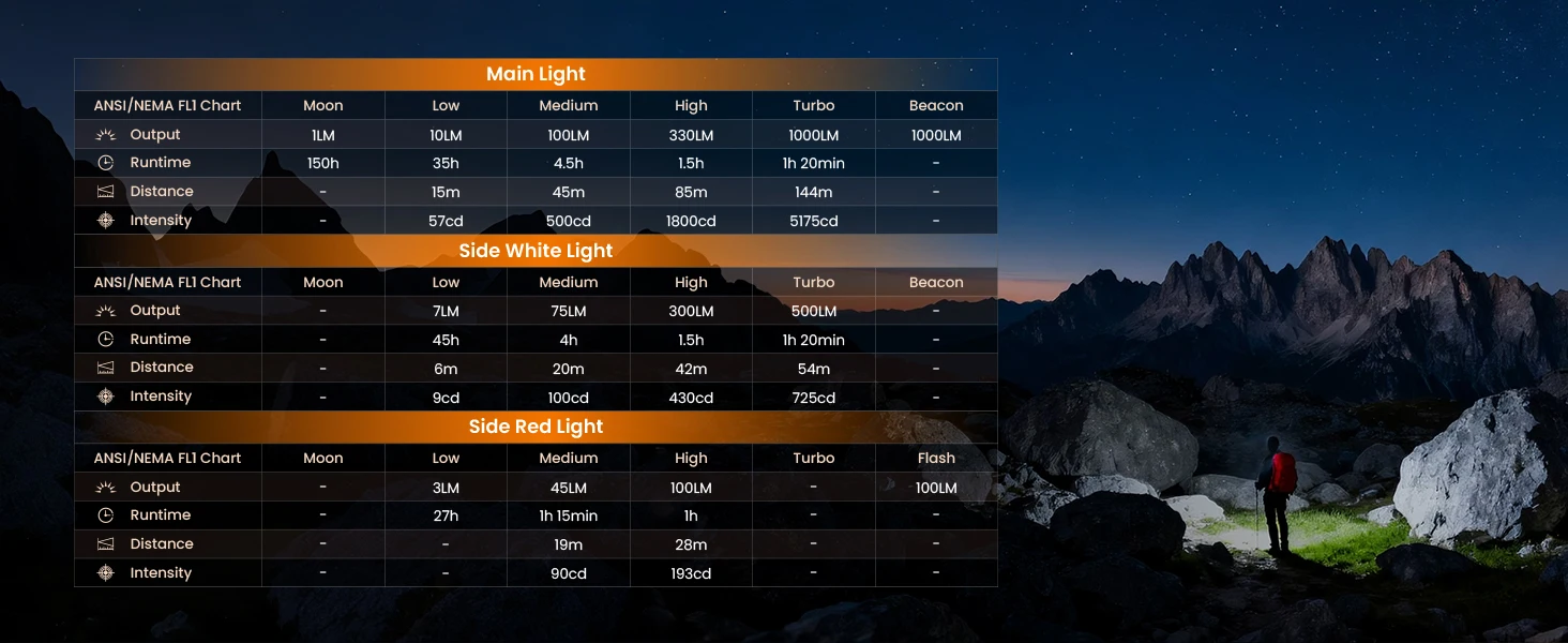 Comes with main spotlight (5 brightness levels + beacon, 144m max range), side floodlight (4 brightness levels, 99° wide beam), and red light (3 steady + flashing modes). Uses high-quality LEDs for bright, long-lasting illumination.