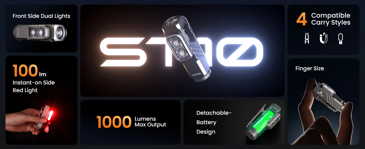 ST10 Is a compact and versatile EDC flashlight featuring a white main light, white side light, and red side light. It comes with a magnetic tail cap and magnetic clip for flexible use in various scenarios. Two separate buttons control the main and side lights for easy operation.
