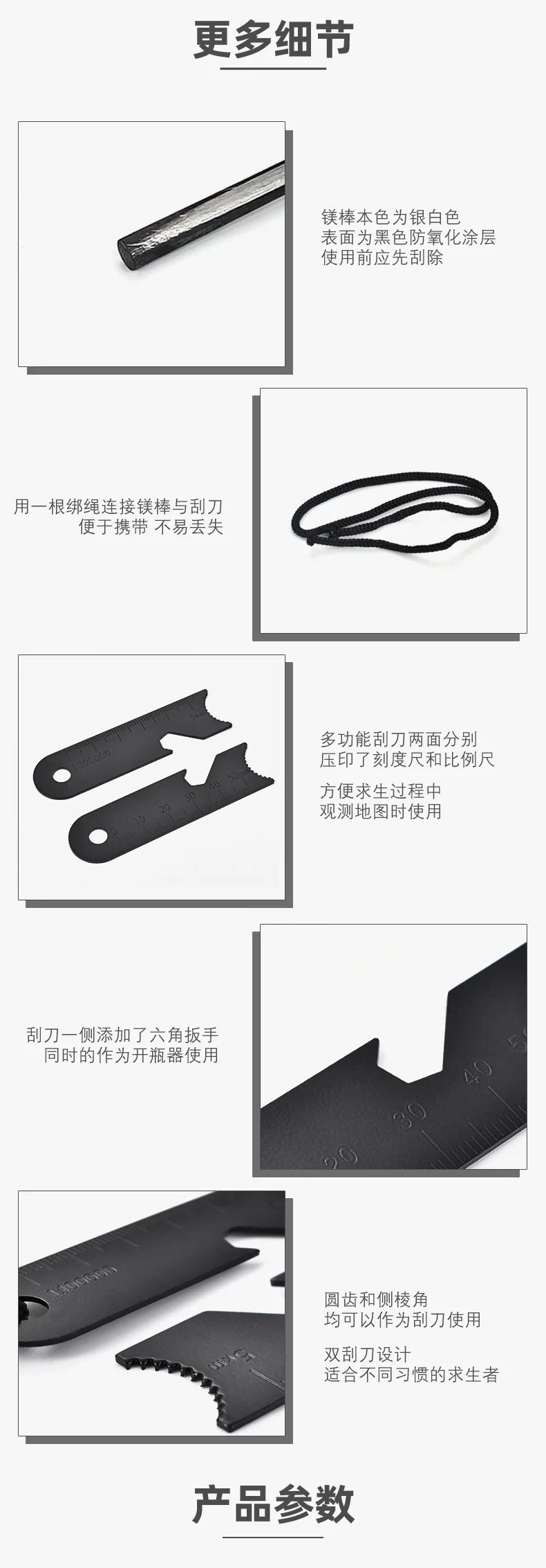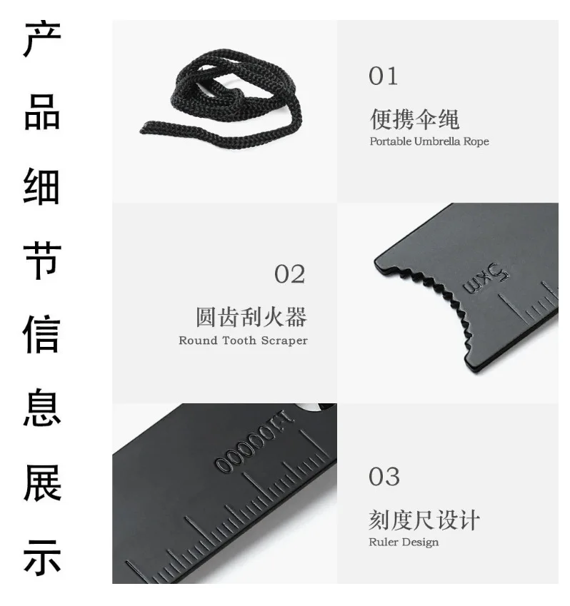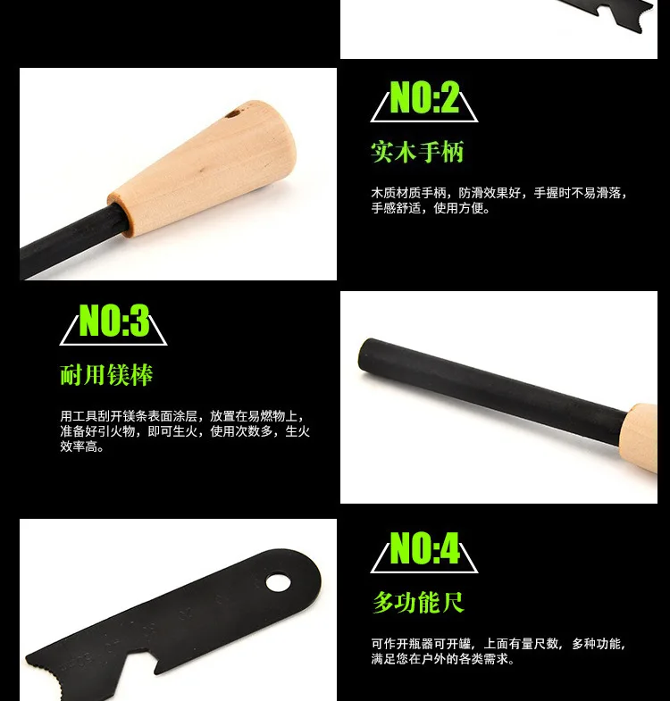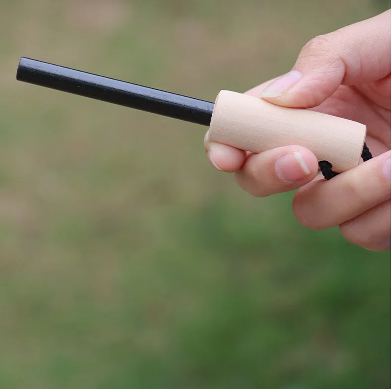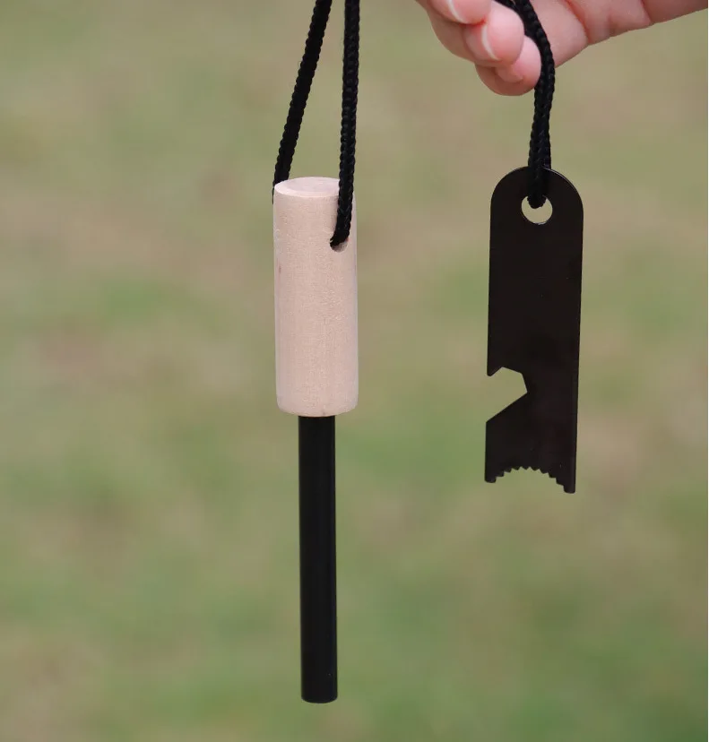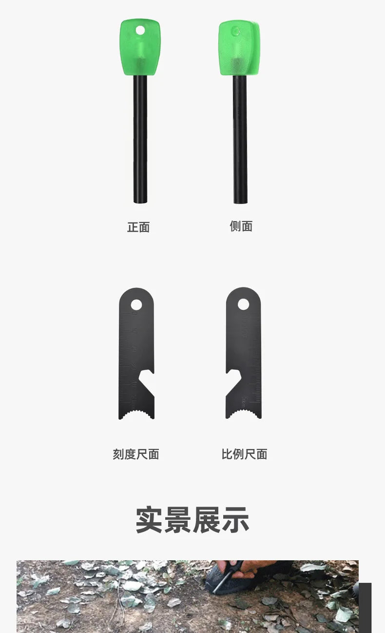 Instructions for use: Use the scraper to scrape off a suitable amount of flint and place it on a small pile of dry grass, leaves, or paper. Quickly strike a magnesium strip to generate sparks and ignite the flame. Once a flame is formed, add a thin wooden stick to create a larger fire.