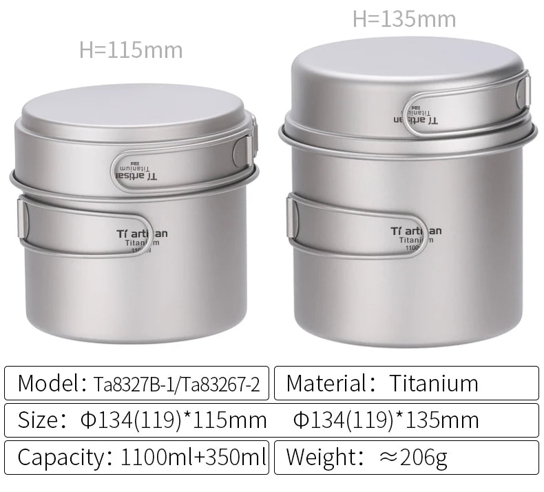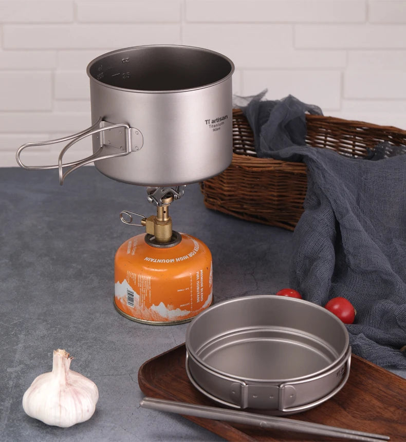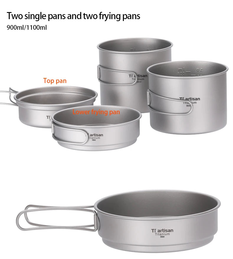 Tiartisan Titanium Folding Handle Camping Pot Frying Pan Set Lightweight Portable Cookware Equipment For Outdoor Hiking Picnic